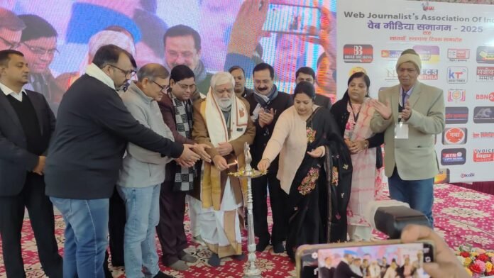भागलपुर 27 दिसम्बर 2025। अंग प्रदेश की रेशमी नगरी भागलपुर के आनंद उत्सव पैलेस, आनंदगढ़ में देश के सबसे बड़े वेब पत्रकार संगठन वेब जर्नलिस्ट्स एसोसिएशन ऑफ इंडिया (WJAI) द्वारा आयोजित वेब मीडिया समागम सह 7वां स्थापना दिवस भव्यता के साथ आरंभ हुआ। कार्यक्रम का उद्घाटन पूर्व केंद्रीय मंत्री अश्विनी कुमार चौबे, माखनलाल चतुर्वेदी पत्रकारिता विश्वविद्यालय के पूर्व कुलपति एवं आचार्य प्रो. डॉ. संजय द्विवेदी, न्यूज़ 18 के ग्रुप एडिटर ब्रजेश कुमार सिंह तथा देशभर से पधारी मीडिया की दिग्गज हस्तियों ने संयुक्त रूप से दीप प्रज्वलन कर किया।